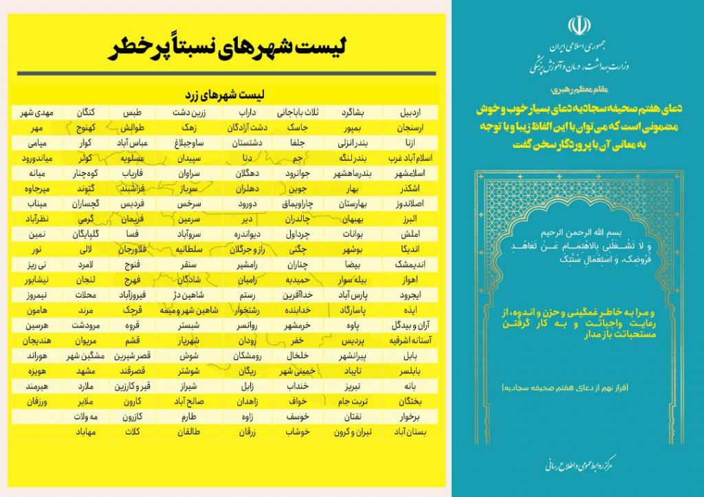 همچنین تعداد شهرهای با وضعیت زرد از ۱۵۴ به ۱۷۴ شهر افزایش و تعداد شهرهای با وضعیت آبی از ۳۵ به ۱۲ شهر کاهش یافت.