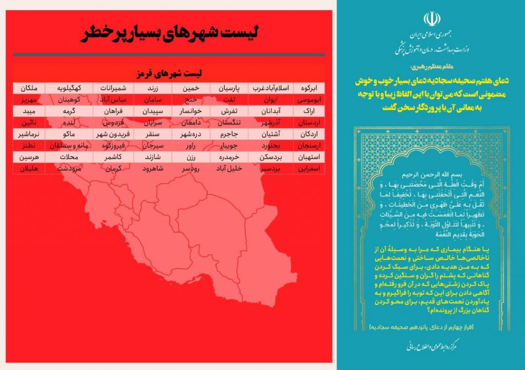 بنا بر اعلام مرکز روابط عمومی و اطلاعرسانی وزارت بهداشت، درمان و آموزش پزشکی، در حال حاضر ۶۴ شهر در کشور در وضعیت قرمز، ۱۶۳ شهر در وضعیت نارنجی، ۲۰۷ شهر در وضعیت زرد و ۱۴ شهر در وضعیت آبی است.