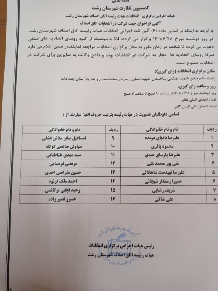 اسامی داوطلبان انتخابات اتاق اصناف رشت