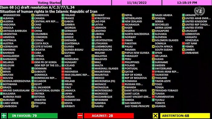 امسال به رغم کارزار تبلیغاتی و رسانهای غرب، این قطعنامه ضد ایران همچون سال گذشته ۷۹ رای موافق کسب کرده است.