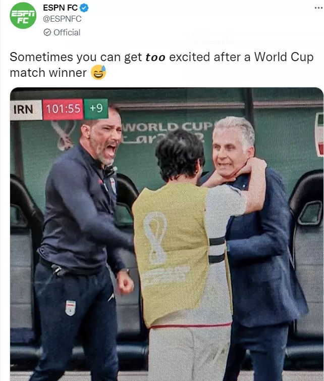 سایت ESPN به حرکت عجیب سردار آزمون و شادی او با کارلوس کیروش در بازی با ولز کنایه زد.