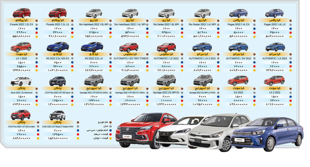 به گزارش پایگاه اطلاع رسانی دیارمیرزا، به نقل از همشهری آنلاین، تاکنون عرضه ۱۱مدل خودرو در قالب ۳ برند کیا، چانگان و فیات در بازار خودروی ایران تأیید شده است که محدوده قیمت آنها بین ۱۲هزار و ۵۰۰ تا ۲۷هزار دلار است.