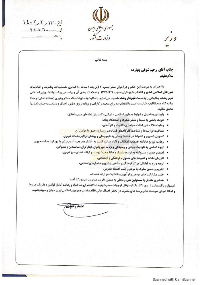 با احترام به موجب این حکم و در اجرای صدر تبصره ۳ ذیل بند ۱ ماده ۸۰ قانون تشکیلات، وظایف و انتخابات شوراهای اسلامی کشور و انتخاب شهرداران مصوب ۱۳۷۵/۳/۱ و اصلاحات بعدی آن و براساس پیشنهاد شورای اسلامی شهر رشت جنابعالی را به سمت شهردار رشت منصوب مینمایم با عنایت به منویات مقام معظم رهبری (مدظله العالی) و مفاد بیانیه گام دوم ،انقلاب شایسته است با انتخاب مدیران متعهد و کارآمد و برنامه ریزی دقیق اهداف و سیاست های ذیل را محقق نمائید.