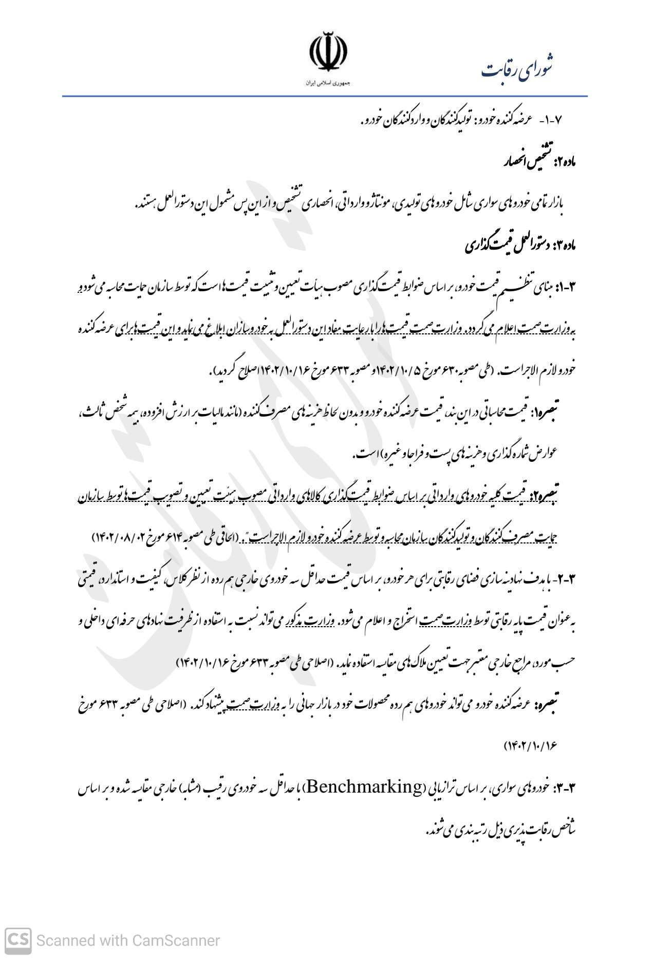 -بند ۳-۲ ذیل ماده ۳ و تبصره آن به شرح ذیل اصلاح میگردد: «با هدف نهادینهسازی فضای رقابتی برای هر خودرو، بر اساس قیمت حداقل سه خودروی خارجی همرده از نظر کلاس، کیفیت و استاندارد، قیمتی بهعنوان قیمت پایه رقابتی توسط وزات صمت استخراج و اعلام میشود. وزارت مذکور میتواند نسبت به استفاده از ظرفیت نهادهای حرفهای داخلی و حسب مورد، مراجع خارجی معتبر جهت تعیین ملاکهای مقایسه استفاده نماید.