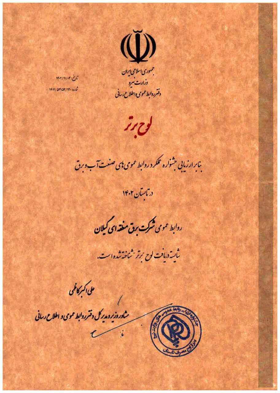 از روابط عمومی شرکت برق منطقهای گیلان به جهت کسب عنوان برتر و دریافت لوح، قدردانی شد.
