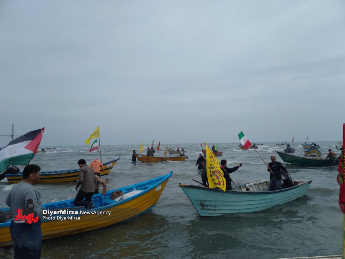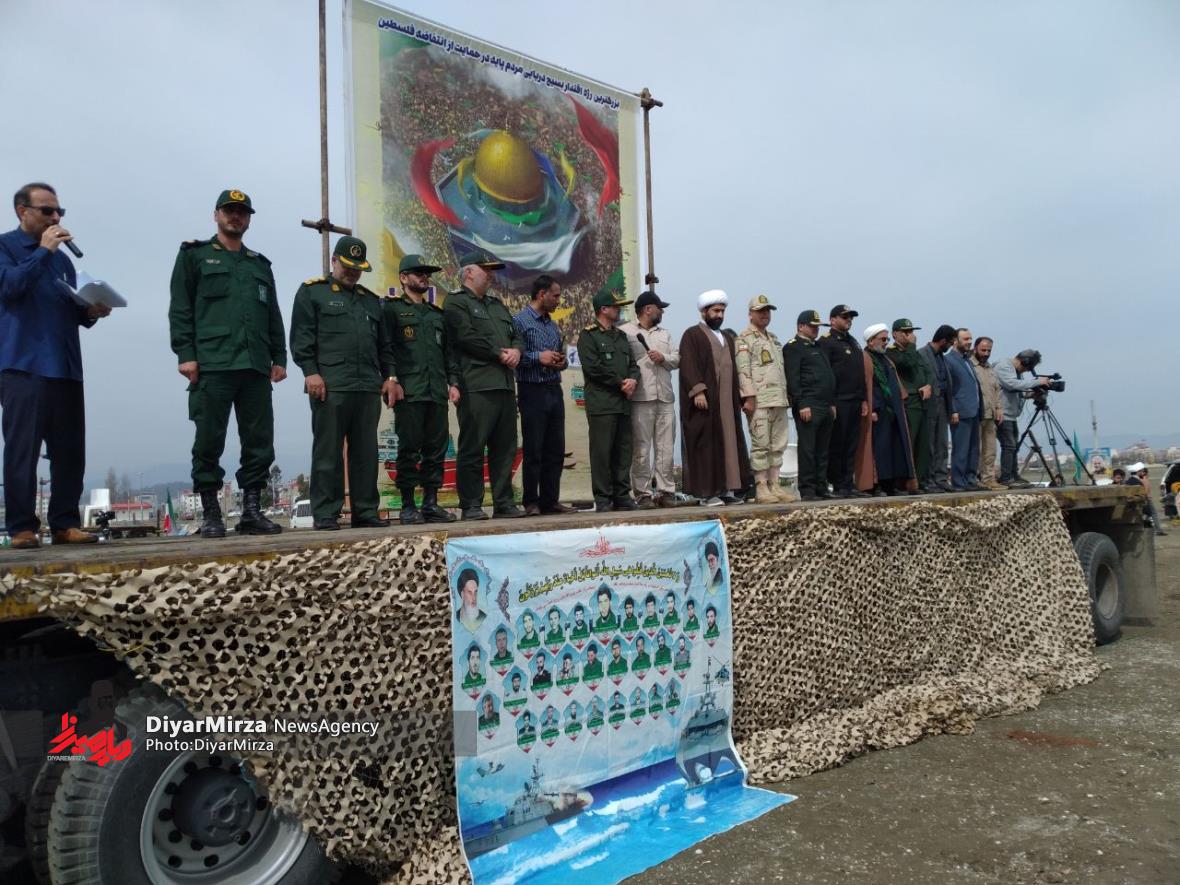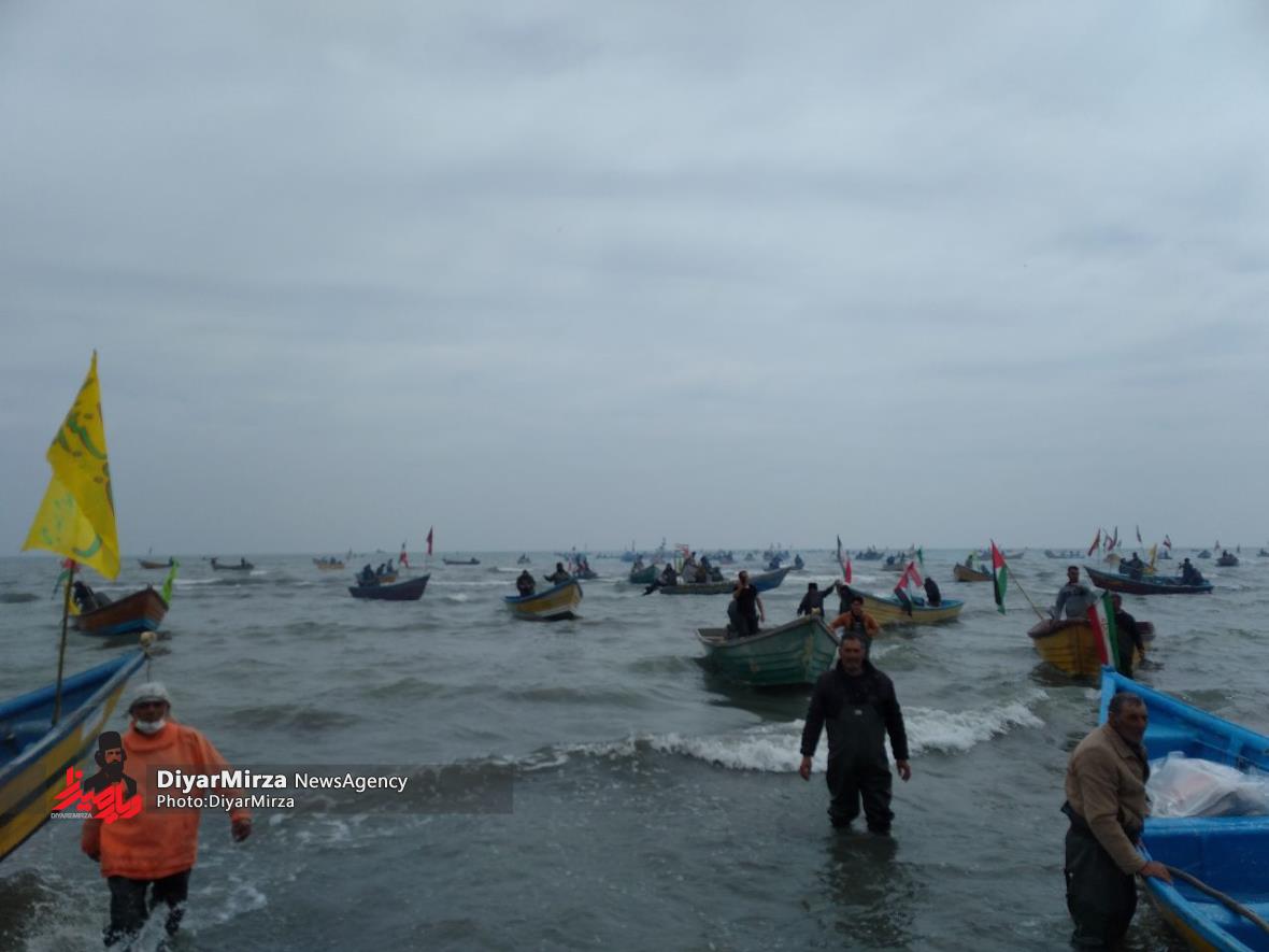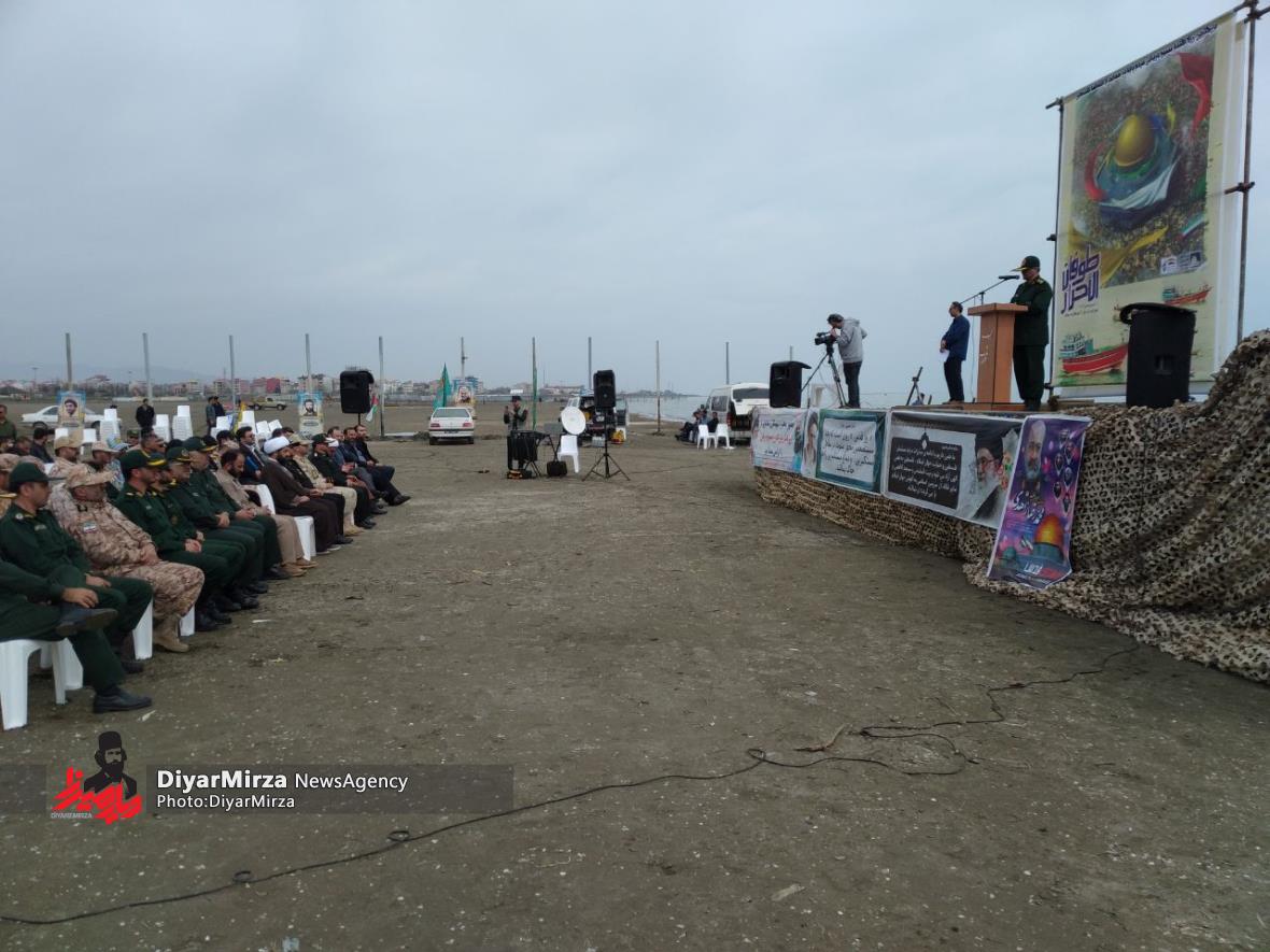 رژه شناوری بسیجیان پایگاه شمال دریایی ثامن الحجج (ع)سپاه پاسداران در حمایت از انتفاضه مردم مظلوم فلسطین و غزه با رمز “یا علیبن ابیطالب (ع)” در نوار ساحلی آستارا برگزار شد.