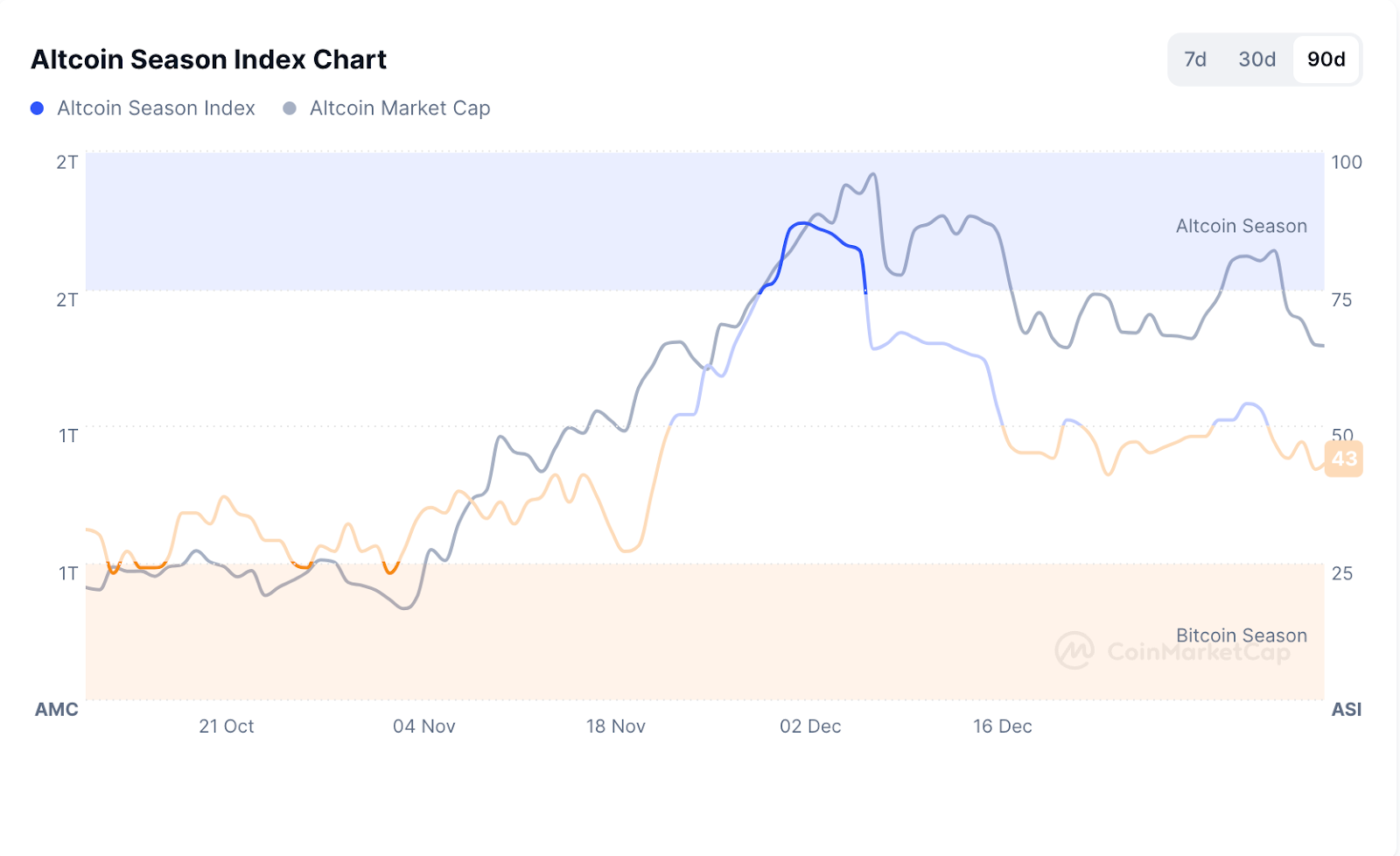 طبق دادههای Total3 که ارزش کل بازار تمام ارزهای دیجیتال به جز بیتکوین و اتریوم را نشان میدهد، ارزش بازار آلت کوینها در حال حاضر حدود ۹۴۳ میلیارد دلار است. بخش آلت کوینها از نوامبر تا دسامبر ۲۰۲۴ (آبان تا آذر ۱۴۰۳) به اوج ارزش بازار ۱.۱ تریلیون دلار رسید، اما این ارزش به سرعت به سطوح فعلی کاهش یافت.