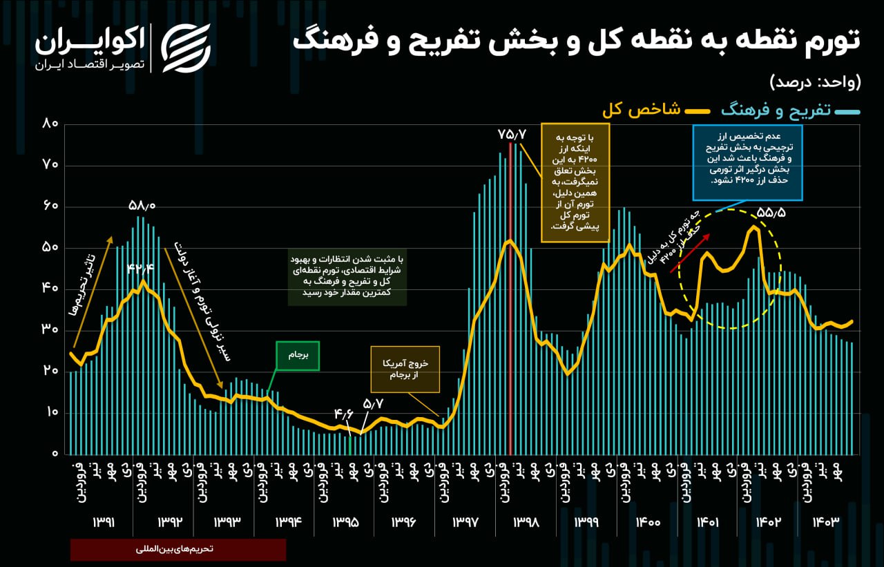 در ابتدای سال ۱۴۰۱، دولت سیزدهم تصمیم به حذف ارز ترجیحی گرفت و این تصمیم روند تورم کشور را بیش از پیش موج دار کرد. البته از آنجایی که به بخش تفریح و فرهنگ ارز ۴۲۰۰ تخصیص نیافته بود، این بخش از اثر تورمی حذف ارز ۴۲۰۰ مصون مانده است. ولی تورم نقطهای کل بالا رفت و در فروردین ۱۴۰۲ به نقطه اوج خود در ۵۵.۵ درصد رسید. به همین دلیل، روند تورم نقطهای کل و بخش تفریح و فرهنگ در سال ۱۴۰۱ و اوایل ۱۴۰۲ هم راستا نیستند. از ابتدای سال ۱۴۰۳ تا پایان آبن ماه نیز شاهد روند افزایشی تورم نقطهای کل هستیم. این در حالیست که تورم نقطهای گروه تفریح و فرهنگ در این دوره نزولی بوده است.