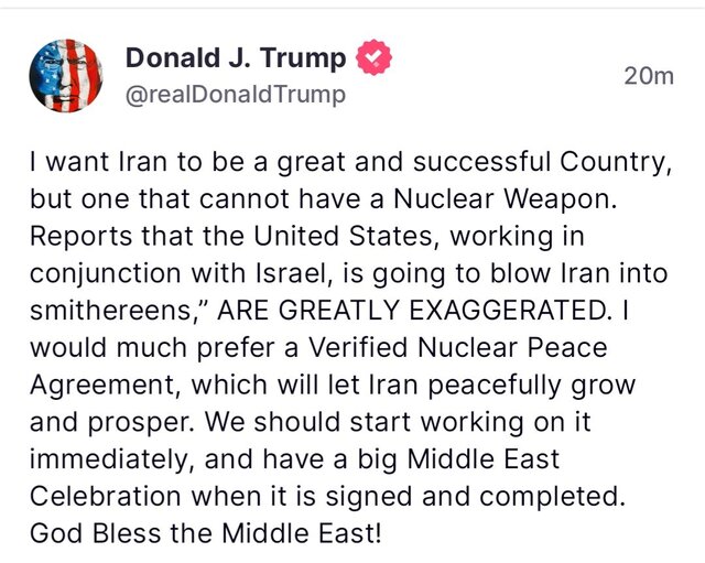 ترامپ در ادامه نوشت: گزارشها درباره این که همکاری آمریکا با اسرائیل، ایران را خرد و خاکشیر خواهد کرد، تا حد زیادی اغراقآمیز است. من بیشتر ترجیح میدهم که توافق صلح هستهای قابل راستیآزمایی داشته باشیم که به ایران امکان رشد و پیشرفت مسالمتآمیز را بدهد.
