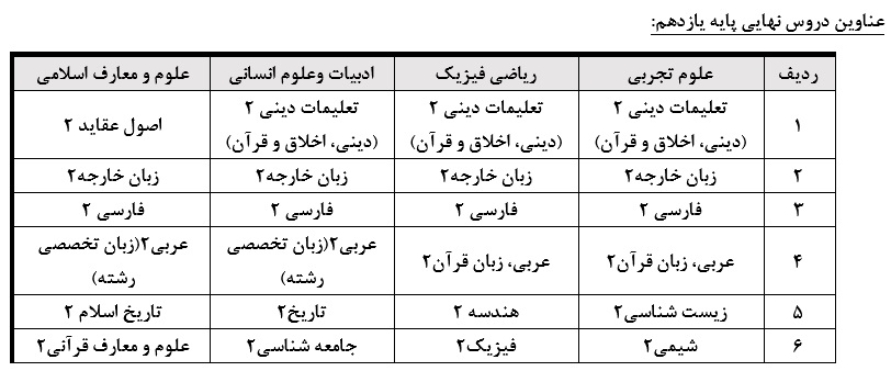 لازم به ذکر است تاریخ اجرای برگزاری امتحانات نهایی پایه یازدهم (۶ درس) پس از هماهنگی با شورای عالی انقلاب فرهنگی اطلاعرسانی خواهد شد.