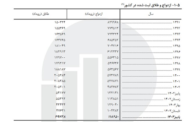 این درحالی است که آمارها نشان میدهد در پاییز سال گذشته ۵۴ هزار و ۱۷۷ رویداد طلاق رخ داده که نسبت به عدد گفته شده برای سه ماهه سوم امسال (۱۴۰۳) بیانگر کاهش ۴۴۳۹ رویداد طلاق در کشور است.