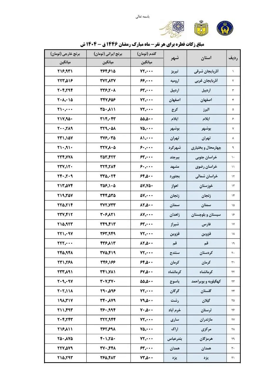 تعیین مبلغ فطریه به تفکیک هر استان؛ نرخ گیلان بالاتر از همدان و خراسان+ جدول