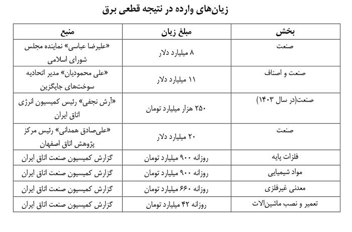 به گزارش پایگاه اطلاع رسانی دیارمیرزا، تاکنون آمارها و ارقام متفاوتی از زیان وارده بر اقتصاد کشور در نتیجه قطعی های مکرر برق ارائه شده است.