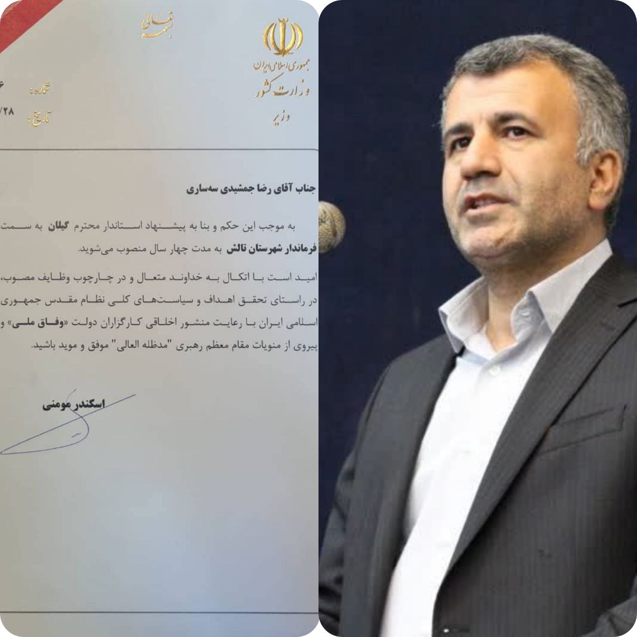 وزیر کشور به پیشنهاد استاندار گیلان، در حکمی رضا جمشیدی سهساری را به عنوان فرماندار شهرستان تالش منصوب کرد.