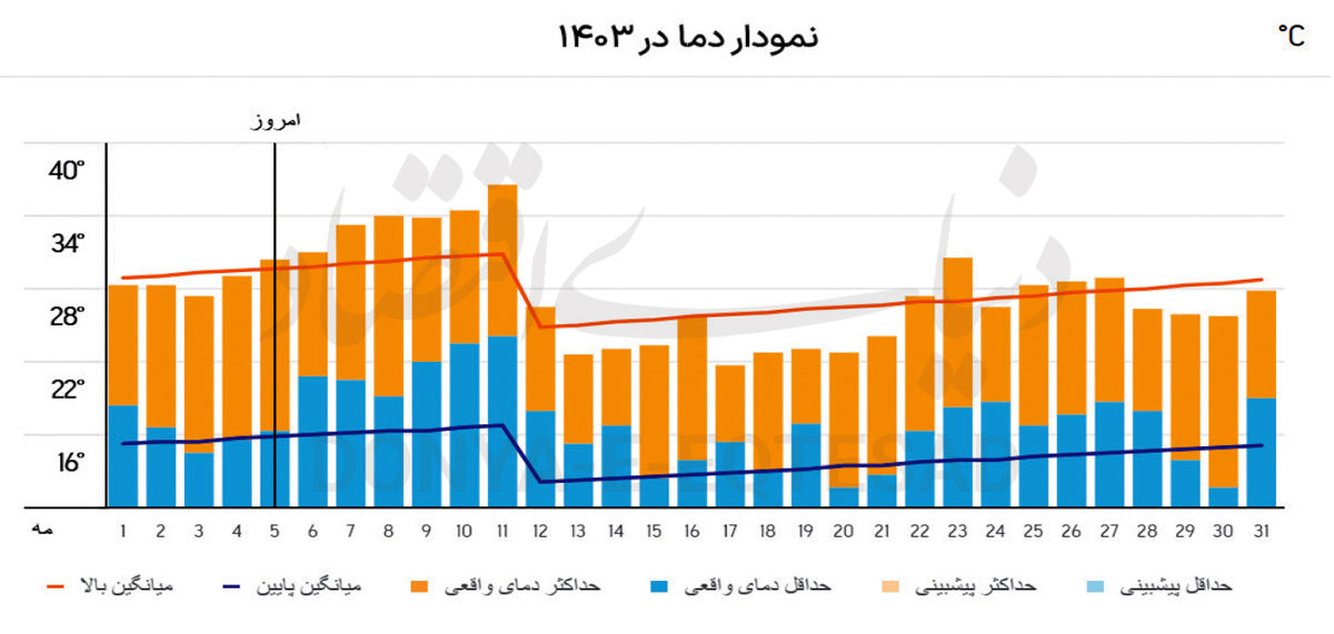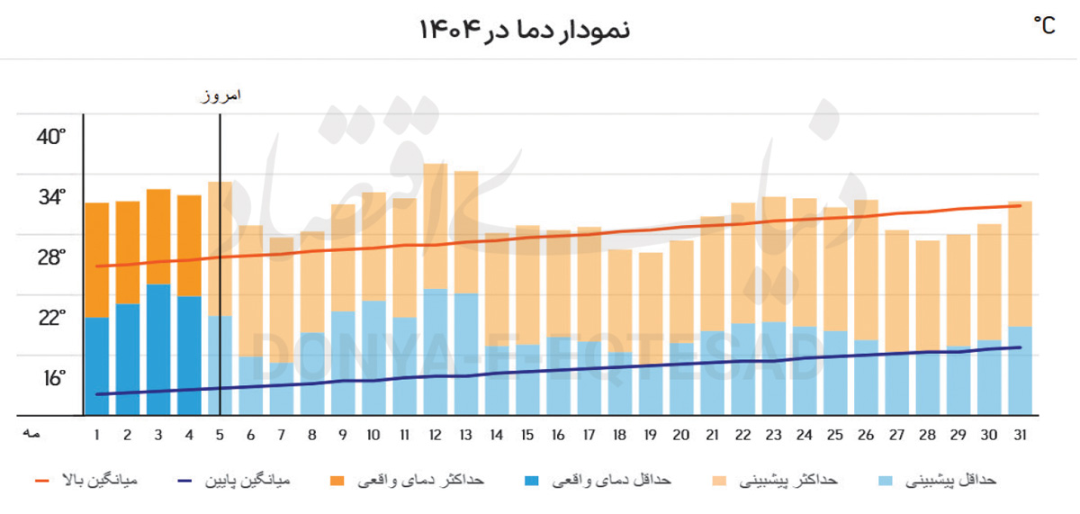بررسی دقیقتر دلایل جهش خیرهکننده مصرف برق نشان میدهد در این موعد از سال نسبت به سال قبل دستکم دمای هوا بین ۴ تا ۷ درجه بیشتر شده است. برای نمونه دمای هوای تهران در ۱۵اردیبهشت در سقف خود معادل ۳۳درجه و در کف خود به حداقل ۲۰درجه رسیده؛ درحالیکه دمای هوا در ۱۵اردیبهشت۱۴۰۳ حداکثر ۲۶درجه و حداقل ۲۴درجه بوده است. بنابراین ممکن است بخشی از افزایش مصرف برق بهدلیل دمای هوا باشد؛ اما افزایش بیسابقه ۲۰هزار مگاواتی پیک مصرف برق ایران در سال۱۴۰۴ را نمیتوان کلا به این داستان ربط داد.