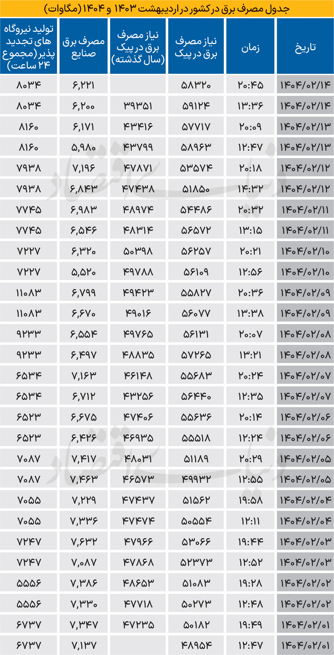 رسیدن مصرف برق به یک قله تاریخی در اردیبهشت ۱۴۰۴ خبر از وضعیت سخت پیش روی کشور دارد. البته در اردیبهشت سال قبل مصرف برق تا ۵۰هزار مگاوات نیز رسیده بود. مهمترین عللی که احتمالا سبب شده تا مصرف برق به این نقطه برسد به ترتیب شامل «اثر افزایش دمای هوا»، «اثر استخراج رمزارز»، «اثر شوک دلار»، «اثر فرسودگی شبکه» و «اثر ترس صنایع از ناترازی در ماههای آتی» هستند.