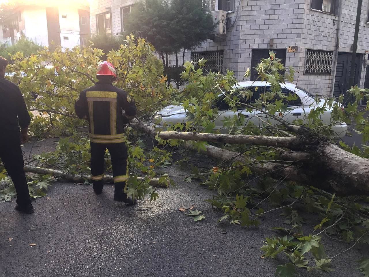 تیمهای آتشنشانی حاضر در محل سریعا با استفاده از تجهیزات تخصصی، درخت سقوطکرده را قطعهقطعه کرده و از روی خودرو کنار زدند.