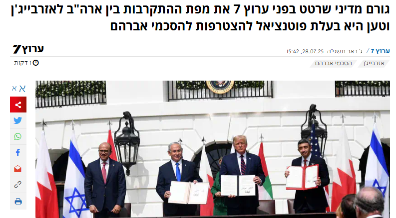 شبکه هفت رژیم صهیونیستی مدعی شد آذربایجان در نظر دارد در پیمان ابراهیم عضو شود. آمریکا تلاشهایی برای تحقق این امر صورت داده است.