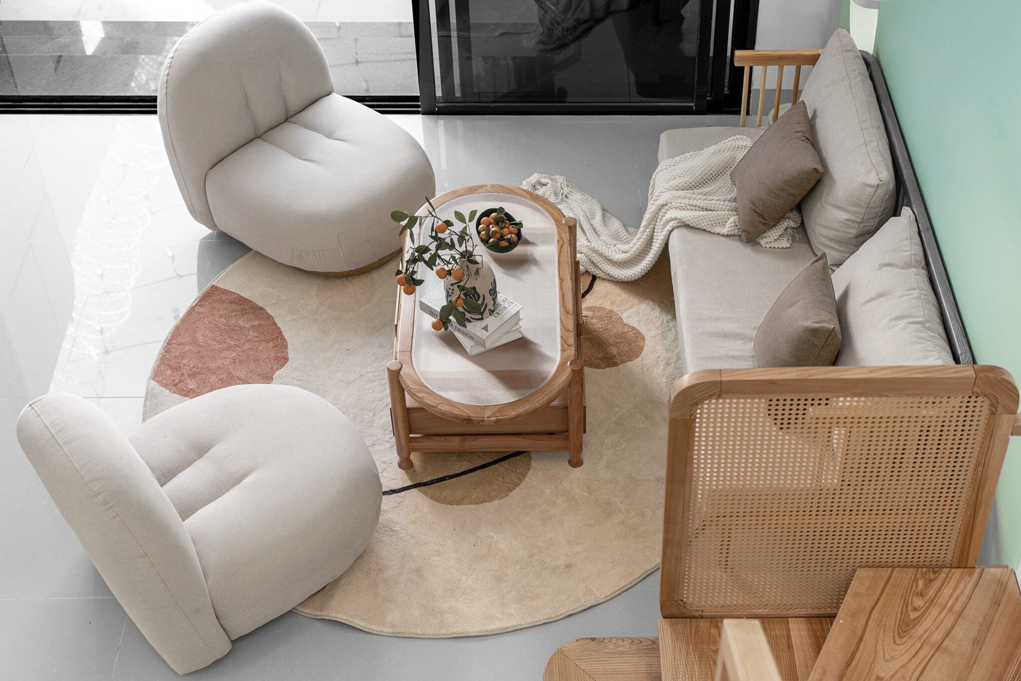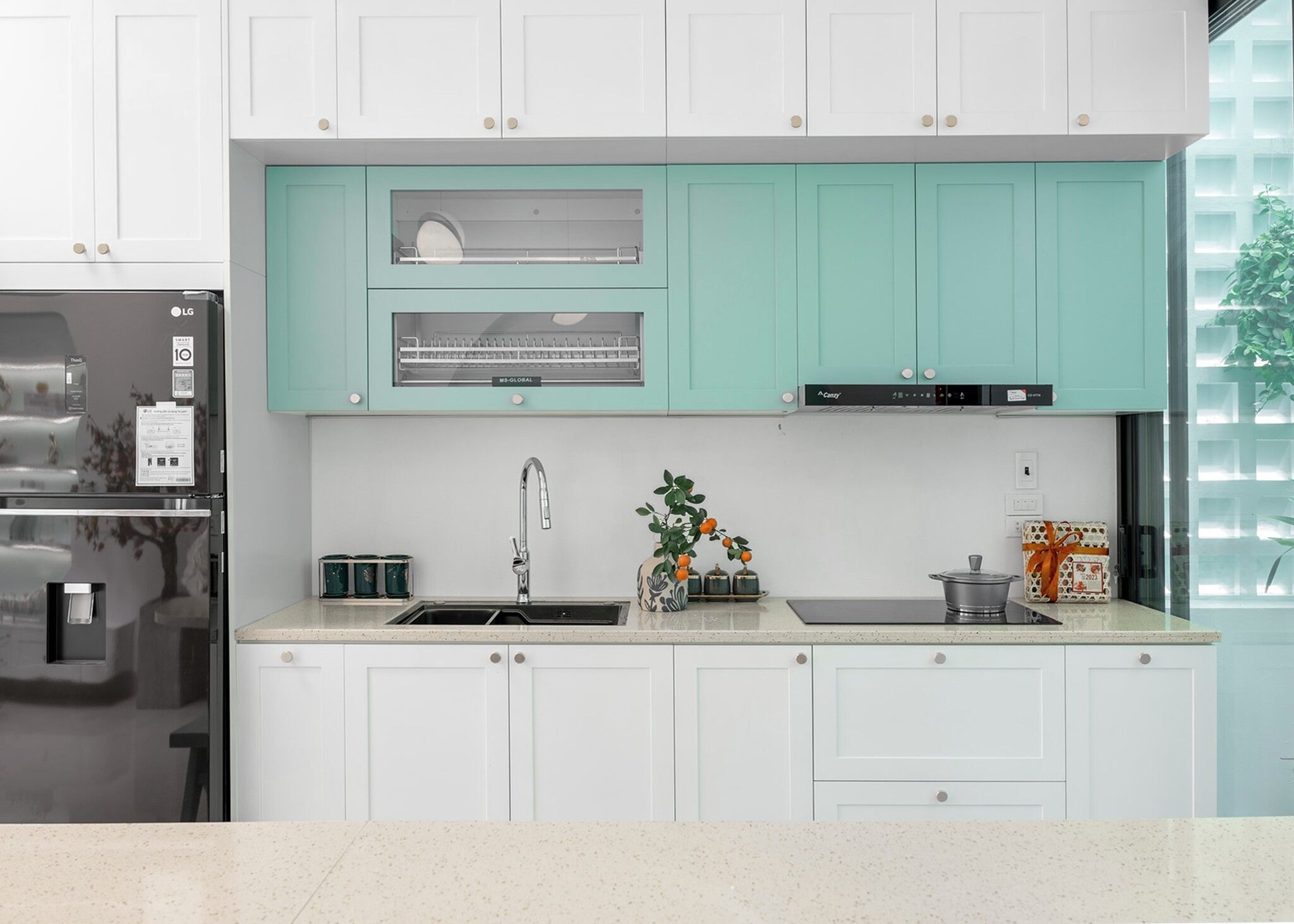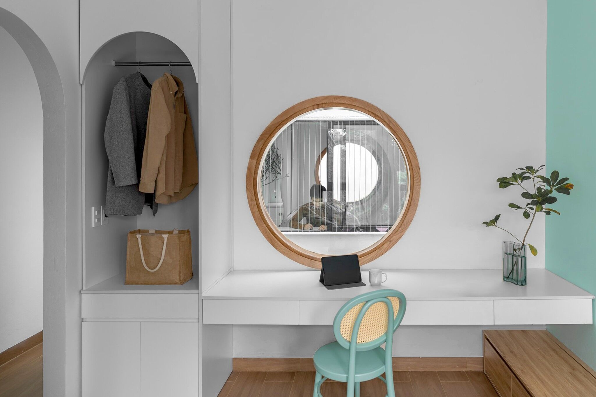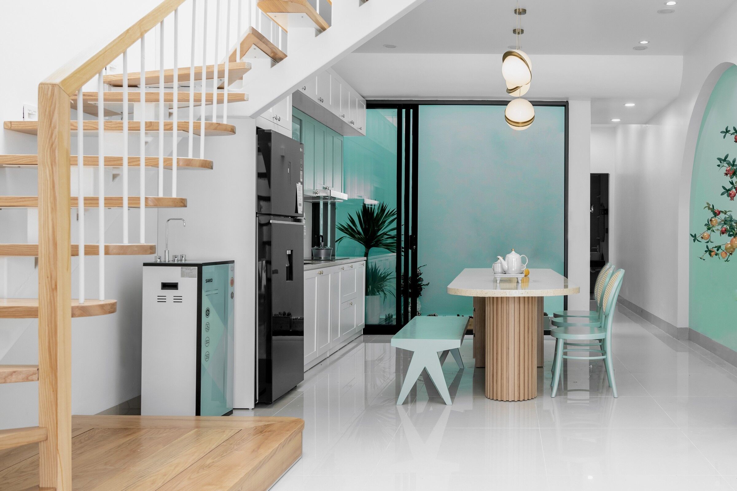 در حالی که ترکیب سفید، سیاه و خاکستری معمولاً برای بزرگتر نشان دادن فضا در خانههای کوچک استفاده میشود، “خانه اِمجِی” با آزمایشی جسورانه در زمینه رنگها، رویکرد متفاوتی در پیش گرفته است. سبز نعنایی به عنوان رنگ پایه، با صورتی پاستلی ترکیب شده تا فضایی سرزنده و پویا ایجاد کند. این دو رنگ متضاد، به دلیل نرمی، به خوبی با هم ترکیب شده و حسی از سبکی میبخشند. در ادامه، رنگ گرم چوب بلوط برای افزودن عمق و حس دنجی به فضا استفاده شده است. در نهایت، تمام این رنگها بر پسزمینهای سفید قرار گرفتهاند تا حسی از پاکیزگی، نظم و آراستگی ایجاد شود.