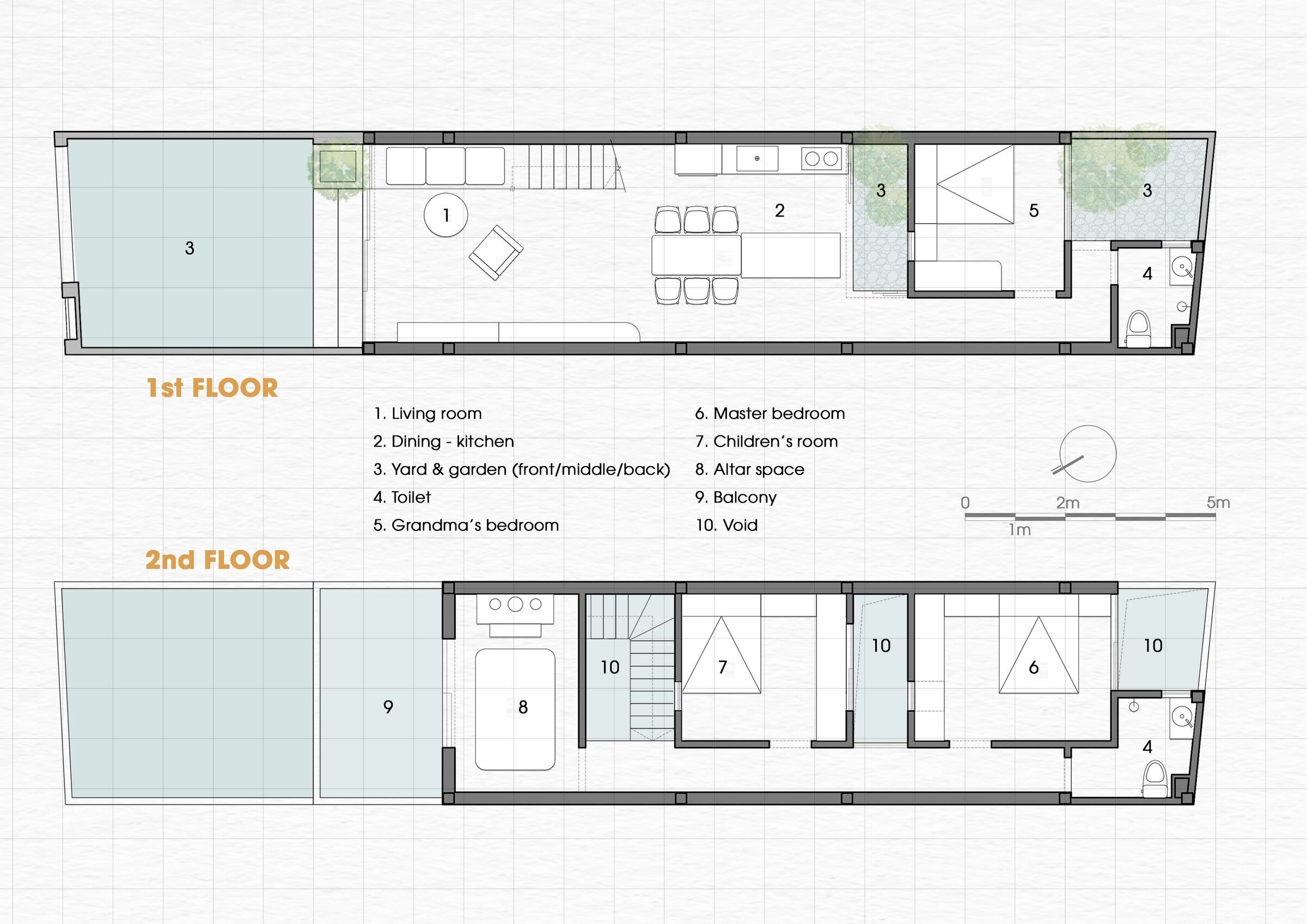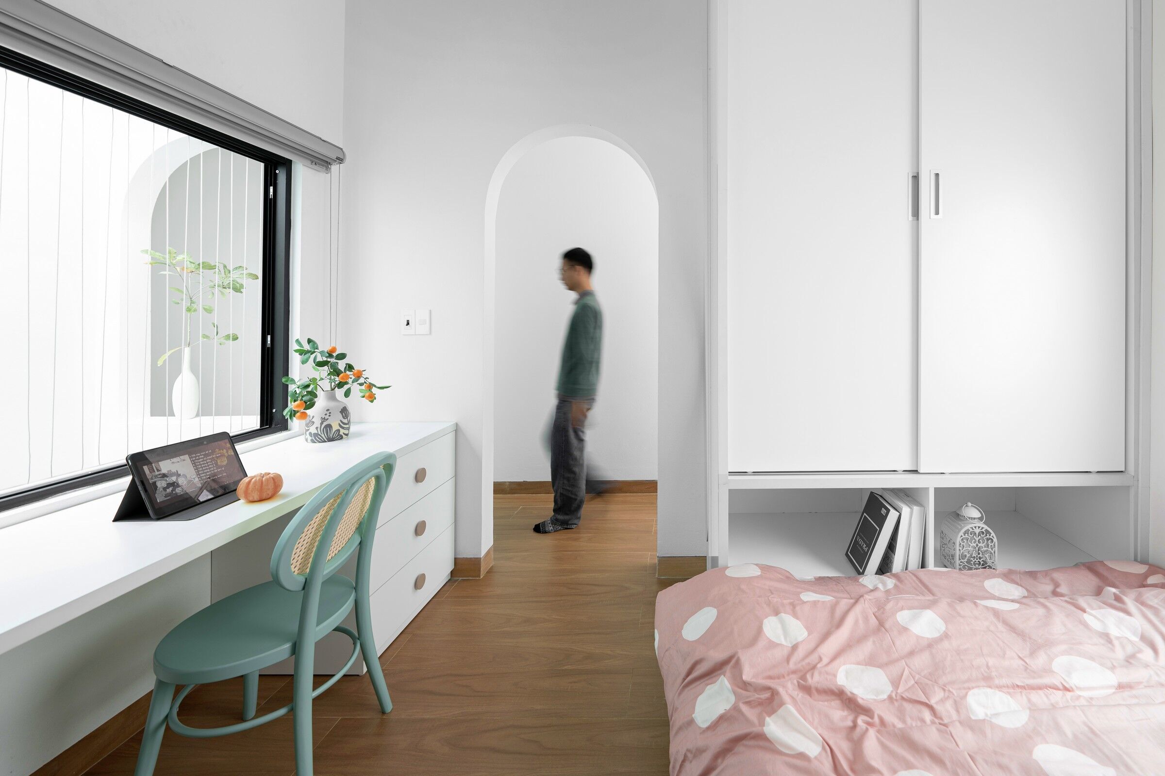 این خانه برای یک خانواده هستهای سهنسلی (مادربزرگ، پدر و مادر و دو دختر) طراحی شده و شامل سه اتاق خواب است. اتاق خواب مادربزرگ در طبقه اول قرار گرفته تا دسترسی برای سالمندان آسان باشد. اتاق خواب اصلی والدین با طراحی ساده و ترکیب رنگهای سفید و چوب، حسی از نظم و پختگی را القا میکند. اتاق خواب دختران با تناوب رنگهای سبز، صورتی و سفید، فضایی پر جنب و جوشتر دارد، بدون اینکه به طراحی کلی خانه لطمهای وارد شود.