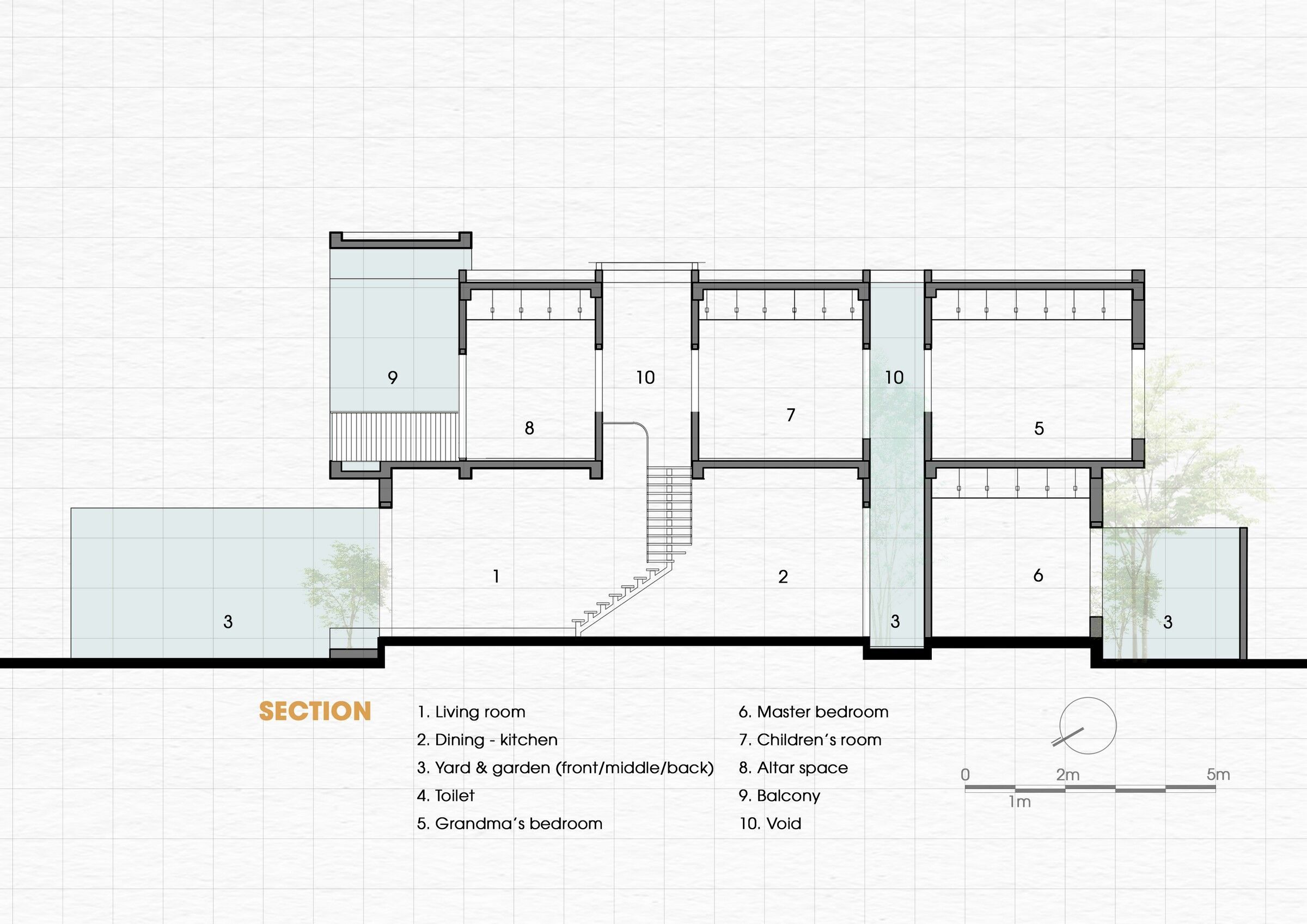 یکی از ویژگیهای خاص فرهنگ ویتنام، گردهمایی خانواده و اقوام در ایام تعطیلات و “تت” (سال نوی ویتنامی) است. به همین دلیل، فضای نشیمن، ناهارخوری و آشپزخانه گسترش یافته تا استفاده از آن راحتتر باشد. این منطقه میتواند با پهن کردن چند تشک، پذیرای بیش از ۲۰ نفر باشد که نشاندهنده طراحی هوشمندانه برای نیازهای فرهنگی است.