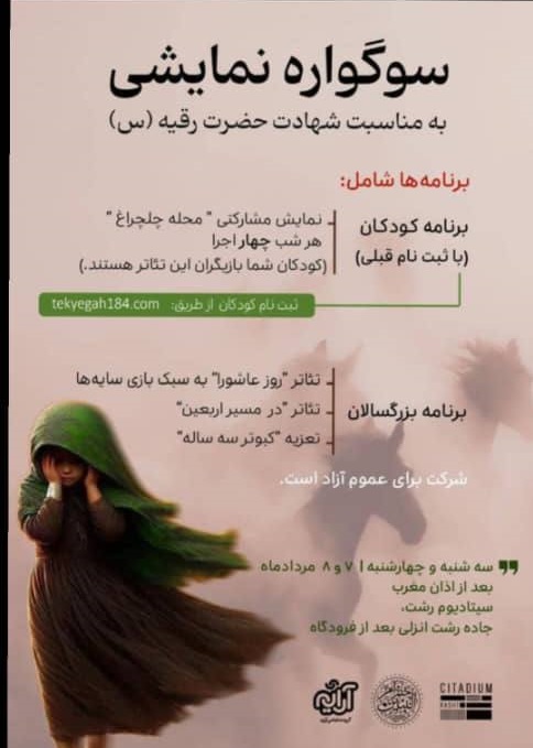 با فرارسیدن ایام شهادت حضرت رقیه (سلاماللهعلیها)، مجموعه سیتادیوم رشت با همکاری «تکیهگاه خانم امالبنین»، گروه هنری «آرایه» و جمعی از هنرمندان متعهد و خلاق، اقدام به برگزاری سوگوارهای نمایشی با محوریت مفاهیم عاشورا و کربلا نموده است.