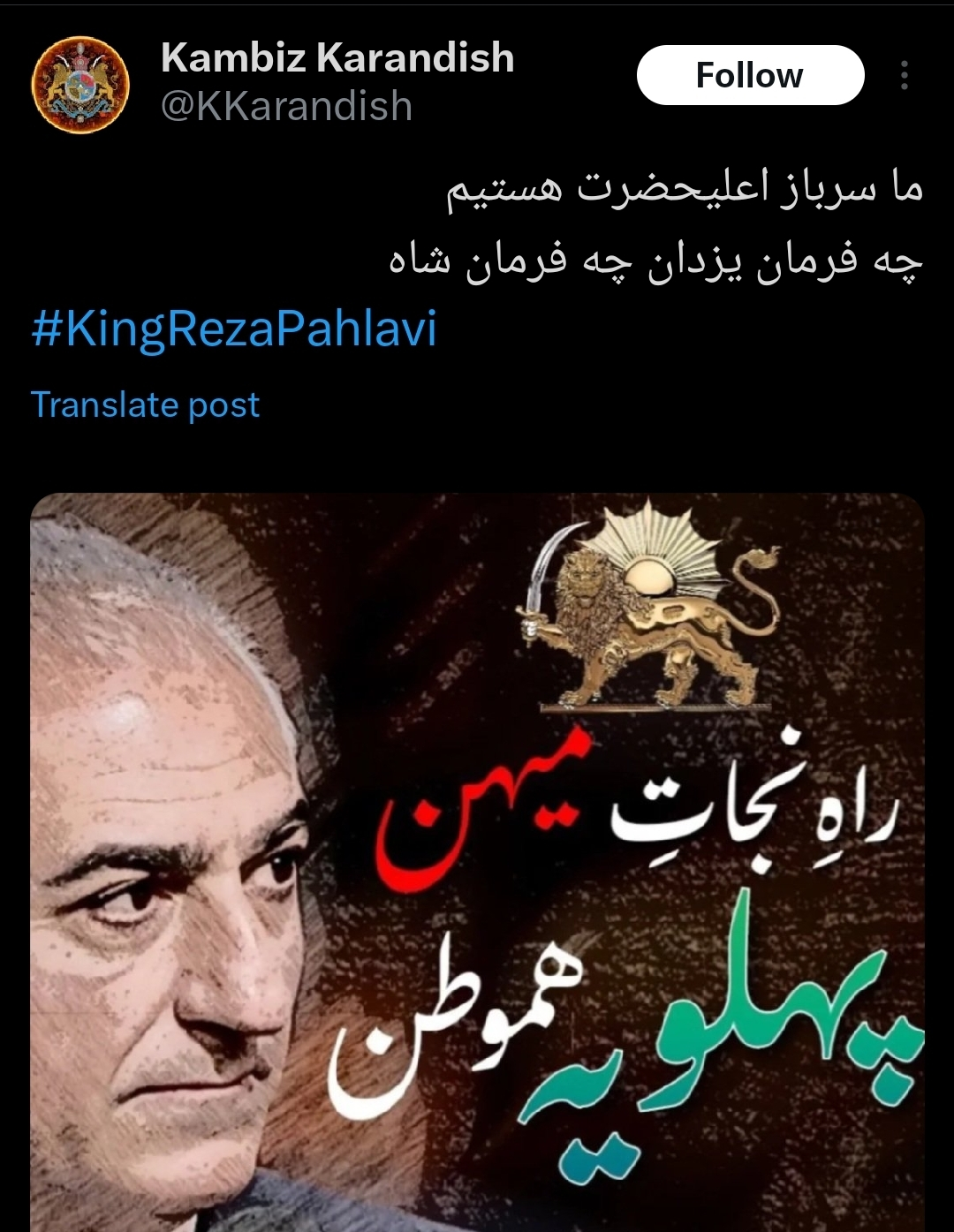 کاراندیش که خود را سرباز پهلوی میخواند، در پیامی گفته بود دوست دارد همه مخالفان او را از بین ببرد.