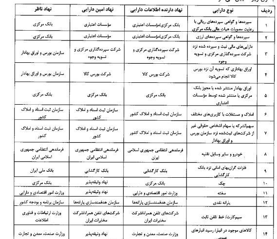 در این آییننامه، برای هر نوع دارایی قابل توثیق، نهادهای مسئول ثبت اطلاعات، نهاد امین دارایی و نهاد ناظر مشخص شدهاند؛ بهعنوان نمونه: