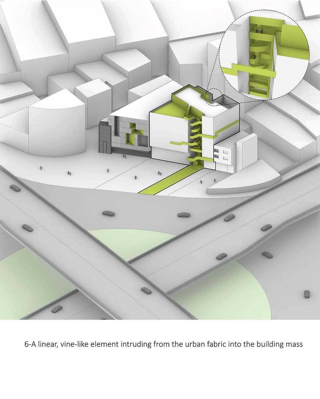 معماری پروژه تلاش دارد نهتنها به زمینهی شهری پاسخ دهد، بلکه مخاطب را درگیر فضایی کند که پویاست، باز است و امکان گفتوگو با محیط پیرامون را دارد.