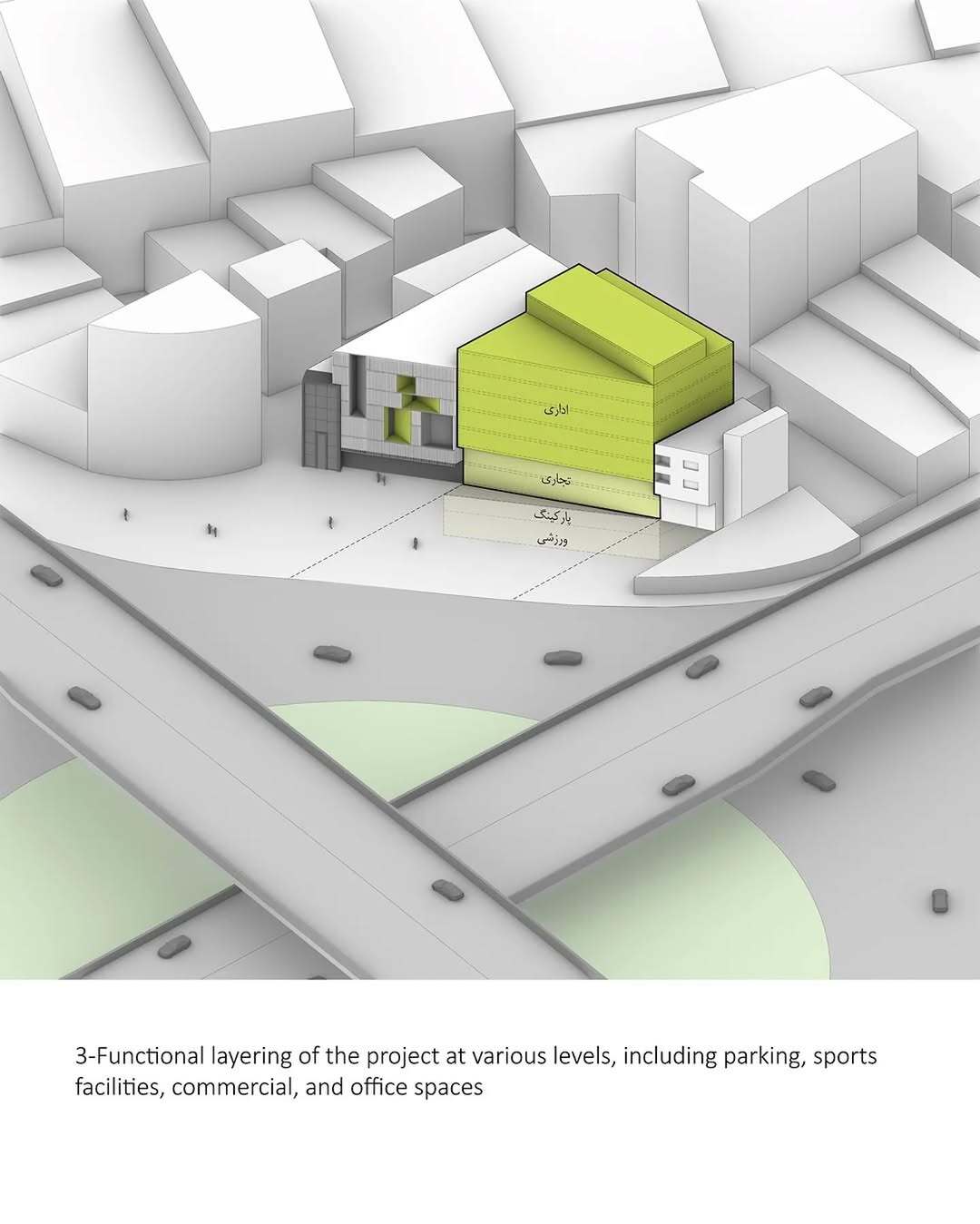 معماری پروژه تلاش دارد نهتنها به زمینهی شهری پاسخ دهد، بلکه مخاطب را درگیر فضایی کند که پویاست، باز است و امکان گفتوگو با محیط پیرامون را دارد.