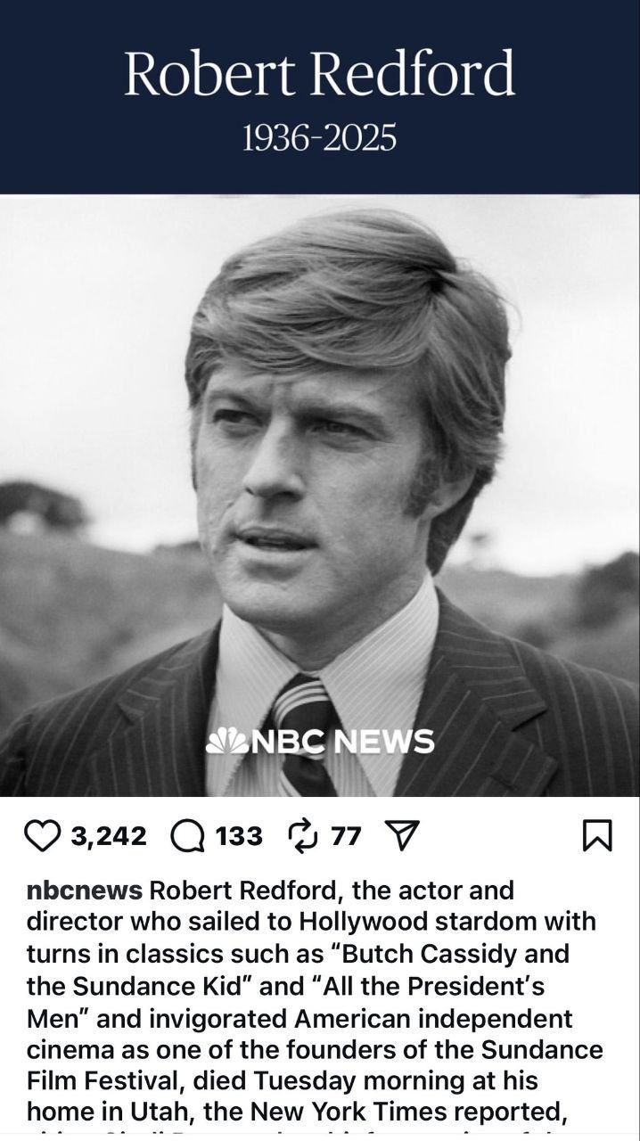رابرت ردفورد، بازیگر و کارگردان برنده جایزه اسکار و ستاره آثار کلاسیک هالیوود از جمله «بوچ کسیدی و ساندنس کید»، «نیش» و «همه مردان رئیسجمهور»، در سن ۸۹ سالگی درگذشت.