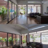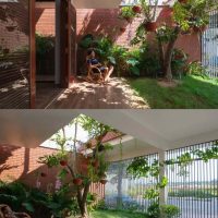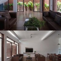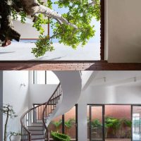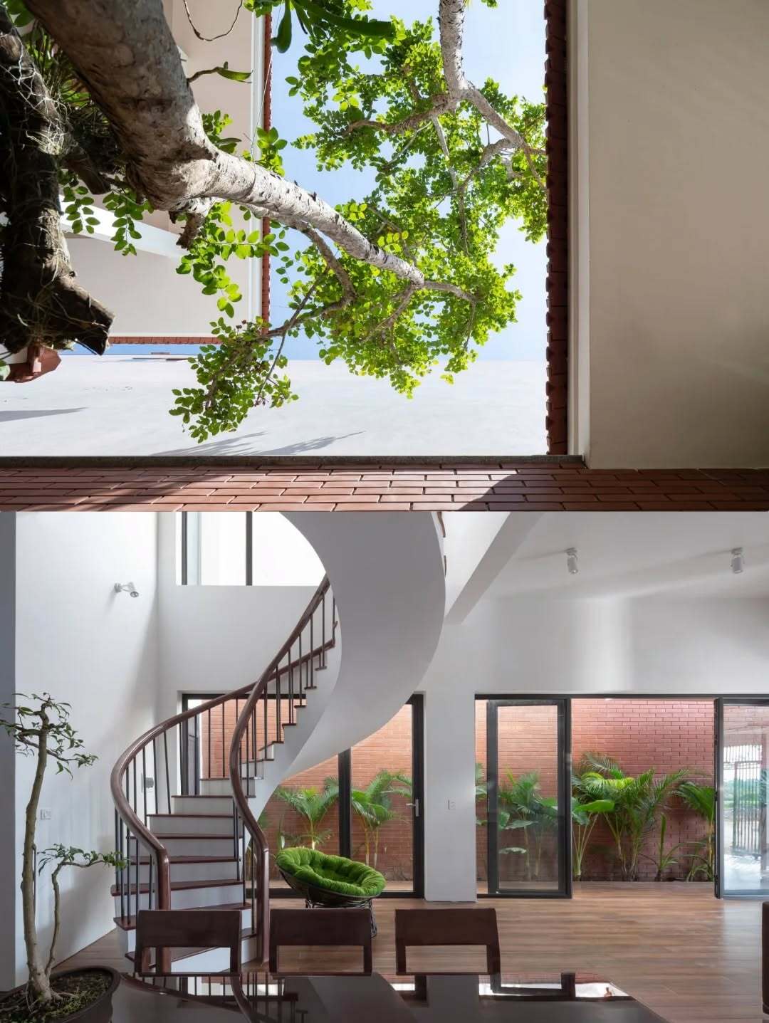 اما نوآوری اصلی در اینجاست که بخشی از سقف برای ایجاد یک فضای باز و نورگیر حذف شده است تا درختان کاشته شده در حیاط بتوانند به رشد خود ادامه دهند و سایهای طبیعی بر روی خانه ایجاد کنند. این فضای باز، تهویه و نور طبیعی را برای کل خانه فراهم میکند و نمادی از همزیستی انسان و طبیعت است.