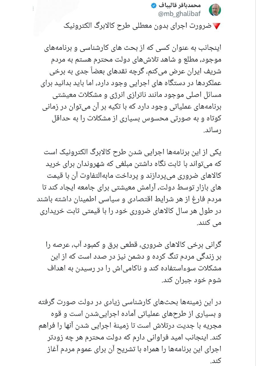 قالیباف: طرح کالابرگ الکترونیک بدون معطلی اجرا شود