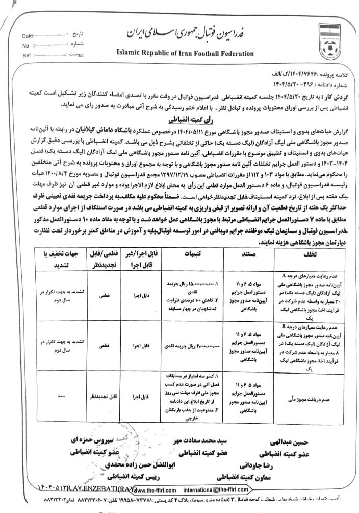 به گزارش پایگاه اطلاع رسانی دیارمیرزا، با توجه به گزارش هیات بدوی و استیناف صدور مجوز باشگاهی در خصوص عملکرد باشگاه داماش گیلانیان در رابطه با آیین نامه صدور مجوز باشگاهی ملی لیگ آزادگان (لیگ دسته یک) حاکی از تخلفات به شرح تصویر زیر میباشد: