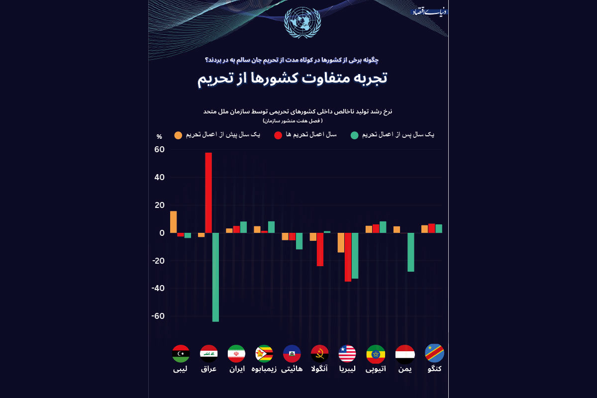 دنیای اقتصاد در گزارشی نوشت: در حال حاضر مجموعا ۳۱کشور تحت تحریمهای ذیل فصل هفتم منشور سازمان ملل قرار دارند که این تحریمها میتوانند شامل محدودیتهای اقتصادی، نظامی، سیاسی و تحریمهای فردی باشند. تجربه کشورهایی مانند کنگو، اتیوپی، آنگولا و زیمبابوه نشان میدهد اثر تحریمها بر رشد اقتصادی کشورها یکسان نیست. در این میان، ایران بهدلیل داشتن اقتصادی بزرگ و متنوع، شامل نفت، صنایع، کشاورزی و خدمات از موقعیت متفاوتی نسبت به کشورهای مورد بررسی برخوردار است.