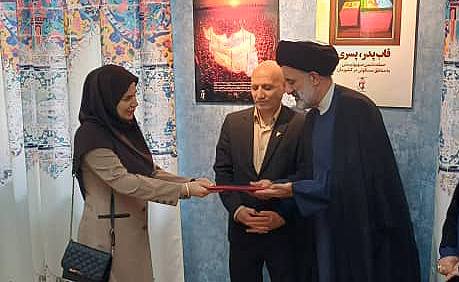 لوح تقدیر نمایشگاه ملی عکس «۱۲ روز ایران» توسط حجتالاسلام سیّد رمضان موسوی مقدم نماینده رهبر انقلاب در بنیاد شهید به خانم مهتاب باقرزاده عکاس دیارمیرزا اهدا شد.