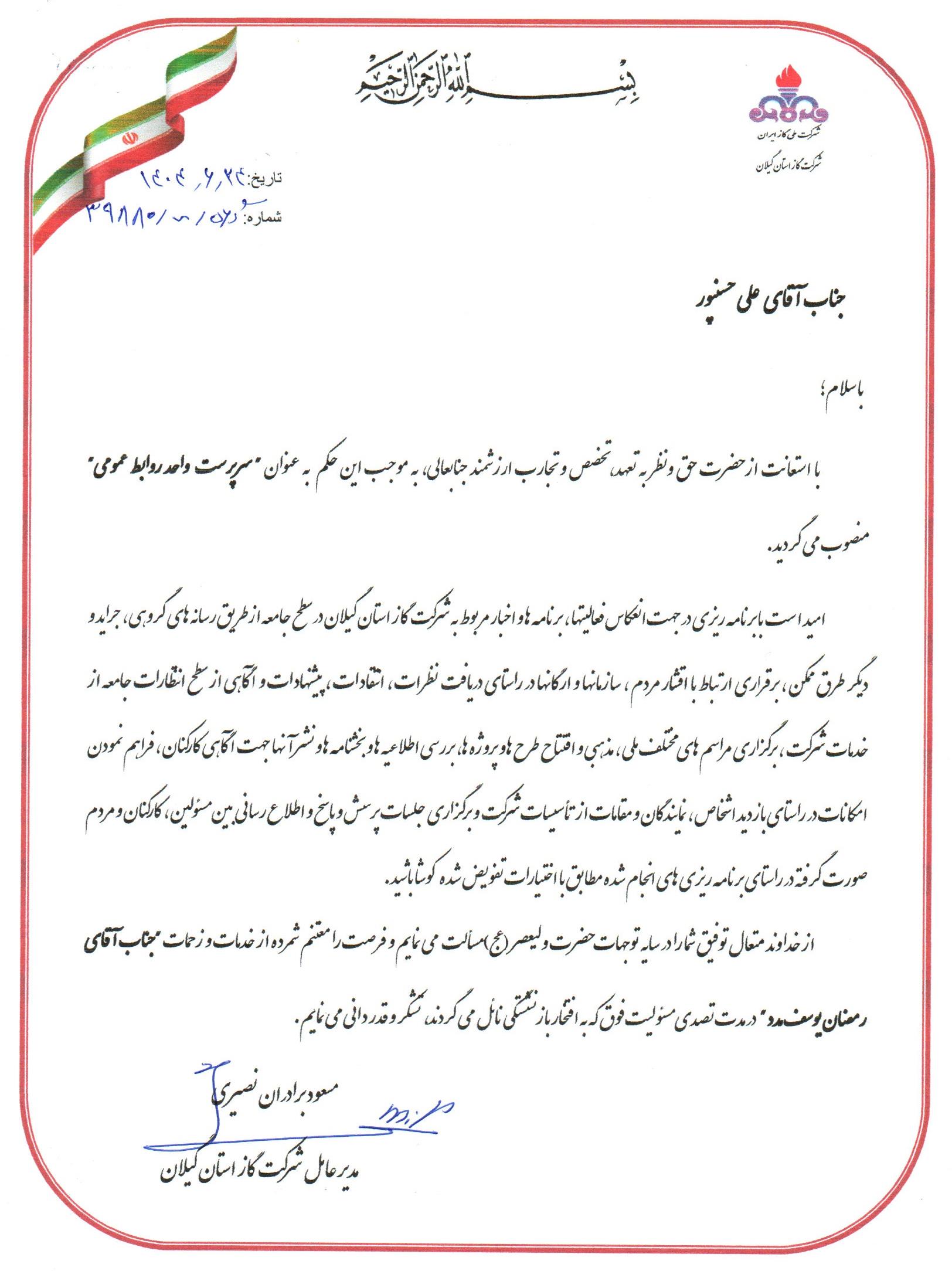 طی حکمی از سوی مدیر عامل شرکت گاز استان گیلان، علی حسنپور به عنوان «سرپرست روابط عمومی» منصوب شد.