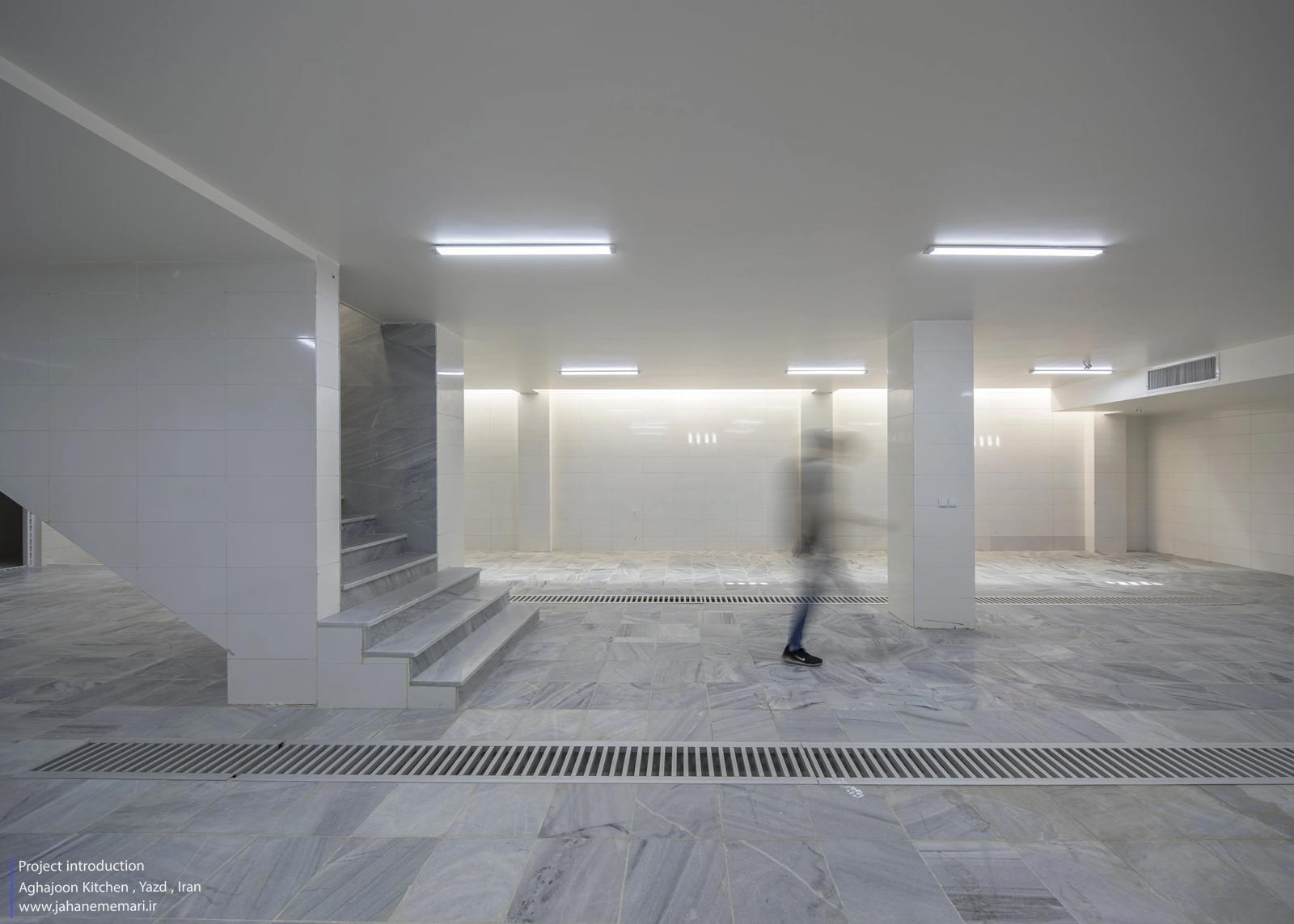 ساختمان در سه طبقه سازماندهی شده است. زیرزمین شامل انبارها، یک اتاق مکانیکی، سرویس های بهداشتی و فضای وضوخانه زنانه است. طبقه همکف شامل فضای اصلی پخت و پز، سرویس های بهداشتی و فضای وضوخانه مردانه است. طبقه همکف که از طریق یک پله با کاشی فیروزهای قابل دسترسی است، به عنوان یک منطقه استراحت عمل میکند.