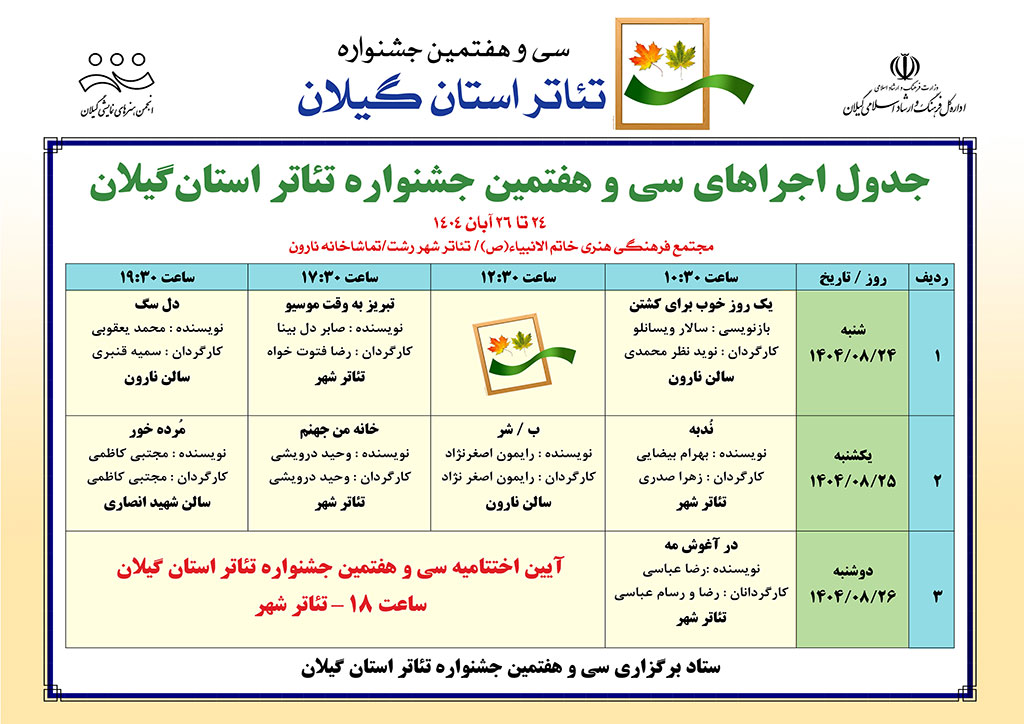 جدول اجرای نمایشهای «سی و هفتمین جشنواره تئاتر استانی گیلان»