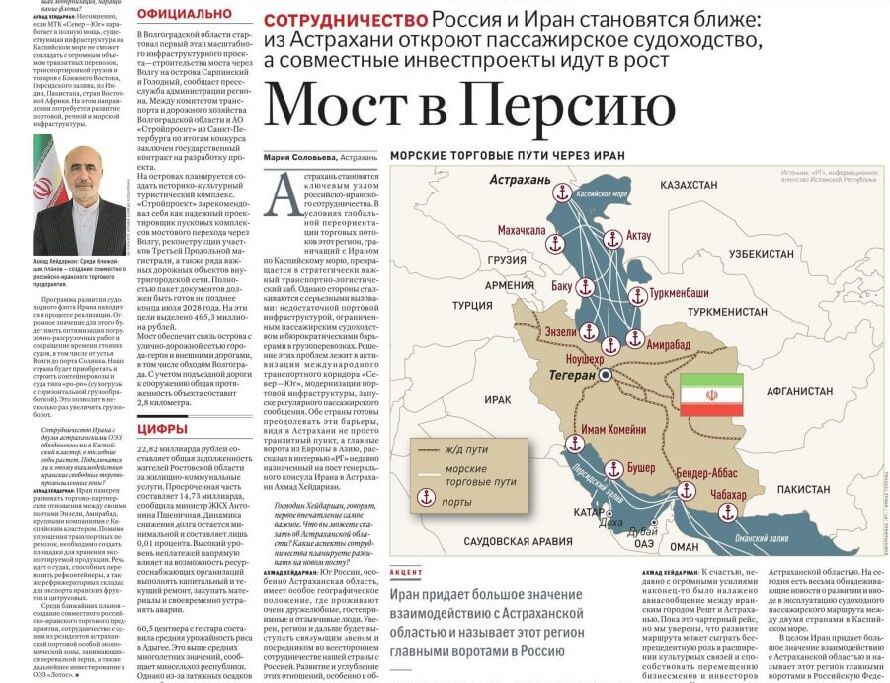 احمد حیدریان، که اخیرا به عنوان سرکنسول ایران در آستراخان منصوب شده است، در مصاحبهای با «راسیسکایا گازتا» اظهار داشت که دو کشور آمادهاند تا بر این موانع غلبه کنند و آستراخان را نه تنها به عنوان یک گذرگاه ترانزیتی، بلکه به عنوان دروازه اصلی اروپا به آسیا میبینند.