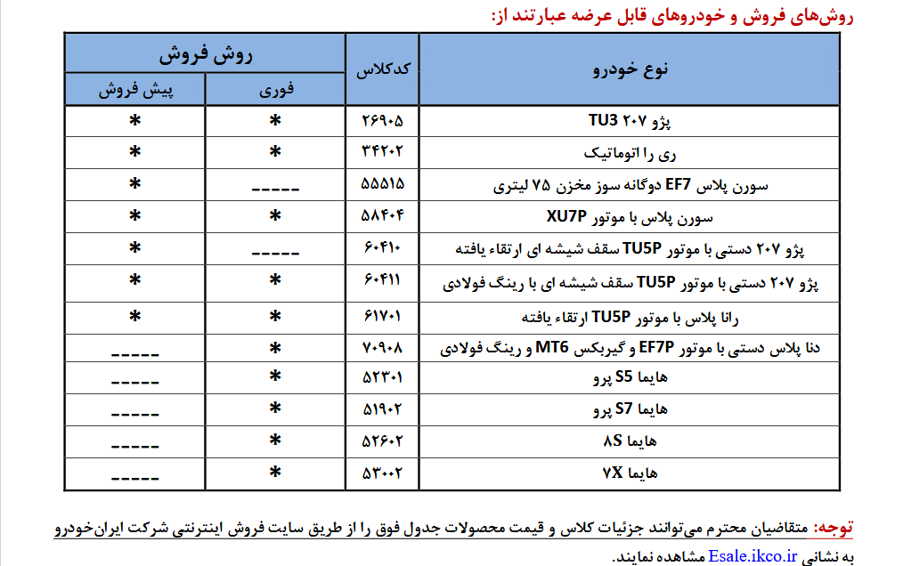 متقاضیان محصولات ایران خودرو می توانند از ساعت ۱۴ روز دوشنبه مورخ ۲۴ آذر تا پایان روز یک شنبه مورخ ۳۰ آذرماه با مراجعه به سایت فروش ایران خودرو به آدرس IKCOSALES.IR طرح فروش این شرکت اقدام به پیش ثبت نام نمایند.
