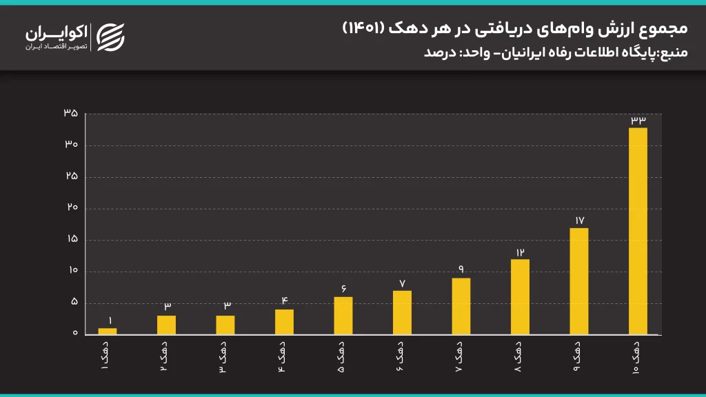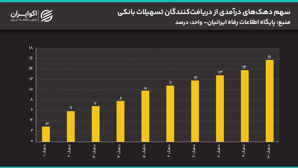 مطابق با دادههای مرکز رفاه ایرانیان، در طی سالهای ۱۳۹۲ تا ۱۴۰۱، سه دهک اول درآمدی مجموعاً به همان اندازه از تسهیلات بانکی برخوردار شدهاند که دهک دهم درآمدی به این تسهیلات دسترسی داشته است.