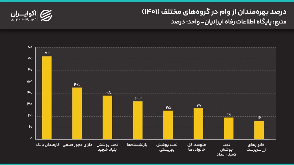 در مقابل، این میزان برای گروههای کمبرخوردار و آسیبپذیر مانند زنان سرپرست خانوار یا افراد تحت پوشش کمیته امداد، به ترتیب ۱۶ و ۱۹ درصد بوده است. این گزارش تصریح میکند که از ۲.۵ میلیون خانوار تحت پوشش کمیته امداد، بیش از ۱ میلیون خانوار در ۱۰ سال گذشته هیچگونه تسهیلات بانکی دریافت نکردهاند.