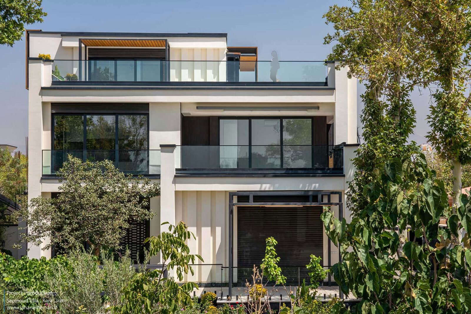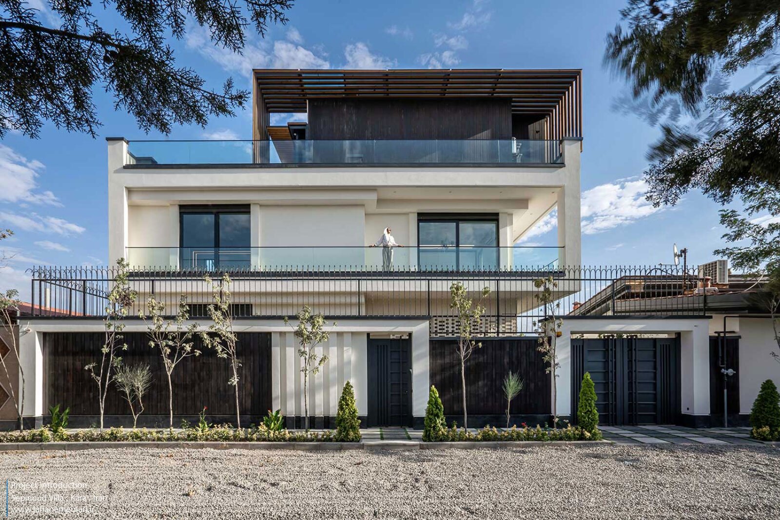 نمای شمالی پروژه (سمت خیابان) به صورت یک مکعب سفید مینیمال طراحی شده، در حالی که نمای جنوبی رو به باغ، ترکیبی از مکعبها و المانهای سفید رنگ است که در هماهنگی کامل با سبزینگی محیط قرار دارند.