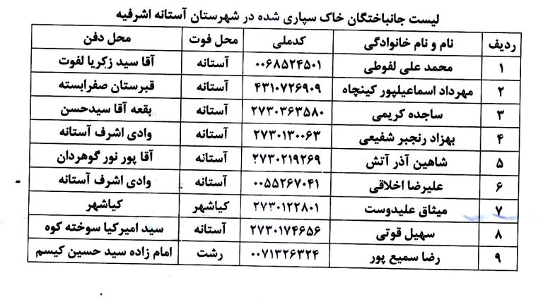 اسامی جانباختگان دی‌ماه در آستانه اشرفیه اعلام شد