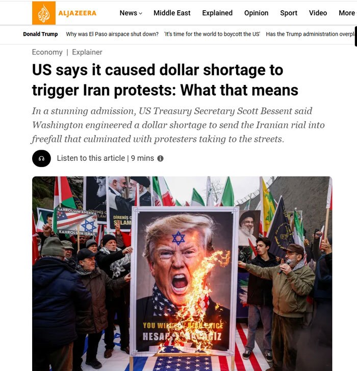 به گزارش پایگاه اطلاع رسانی دیارمیرزا، خبرگزاری الجزیره در گزارشی به نقش آمریکا در مهندسی ناآرامی های اخیر در ایران پرداخته؛ ناآرامی هایی که بنا به نوشته این گزارش، به قیمت جان هزاران ایرانی انجامیده است.