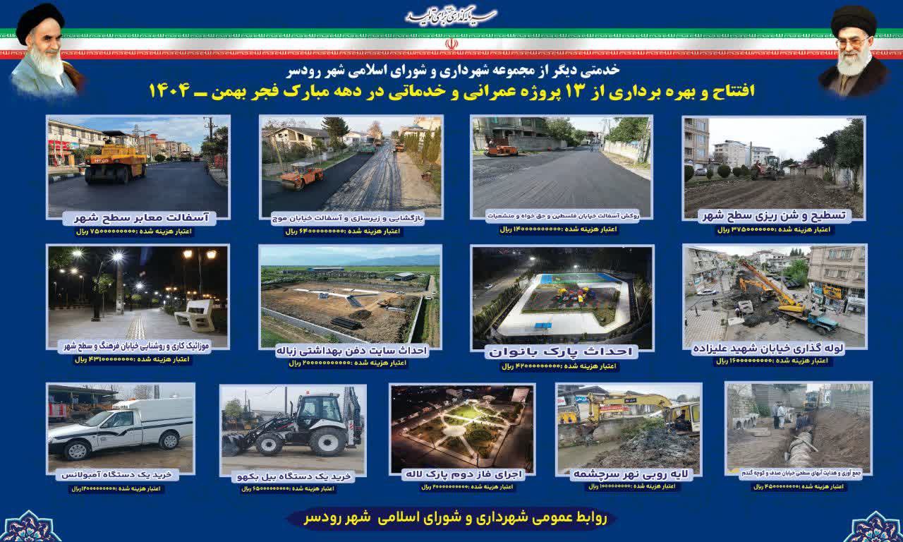 به گزارش پایگاه اطلاع رسانی دیارمیرزا، همزمان با دهه مبارک فجر ۱۴۰۴، مجموعه شهرداری و شورای اسلامی شهر رودسر از افتتاح و بهرهبرداری ۱۳ پروژه عمرانی و خدماتی در سطح این شهر خبر داد؛ پروژههایی که با هدف ارتقای زیرساختهای شهری، بهسازی معابر، توسعه فضاهای عمومی و تقویت خدمات شهری اجرا شدهاند.