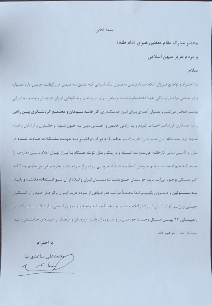 متأسفانه در ایام اخیر به جهت مشکلات حادث شده در بازار و تأمین مالی کارخانه، فرزندم به اشتباه و در یک زمان کوتاه همگام با بازار تهران اعلام بستن مغازهها را نمود که هم اینجانب و هم خودش کاملاً به اشتباه خود پی برده و از مردم عزیز عذرخواهی مینمایم چرا که اگر مشکلی بود باید حواسمان جمع باشد تا دشمنان ایران و اسلام از آن سوء استفاده نکنند و باید به مسئولین و دلسوزان بگوییم.