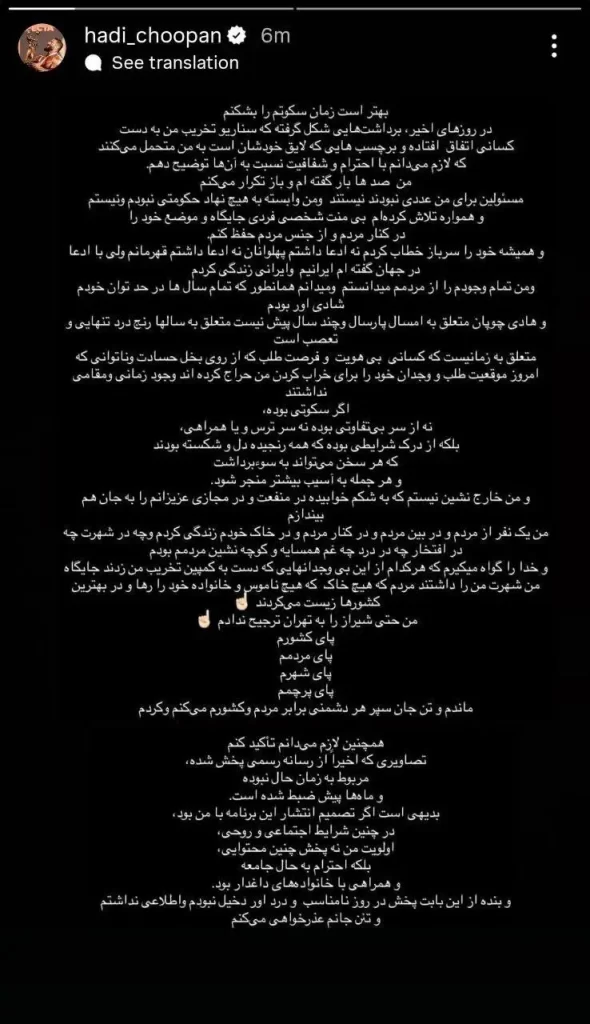به گزارش پایگاه اطلاع رسانی دیارمیرزا، هادی چوپان، قهرمان بدنسازی و چهره مشهور ورزشی، در واکنش به انتقادها و فشارهای اخیر برخی افراد، پس از انتشار ویدیویی از حضور او به عنوان داور در برنامه «کاپیتان» و رقصش با شرکتکنندگان، دو استوری طولانی منتشر و توضیحاتی ارائه کرد.