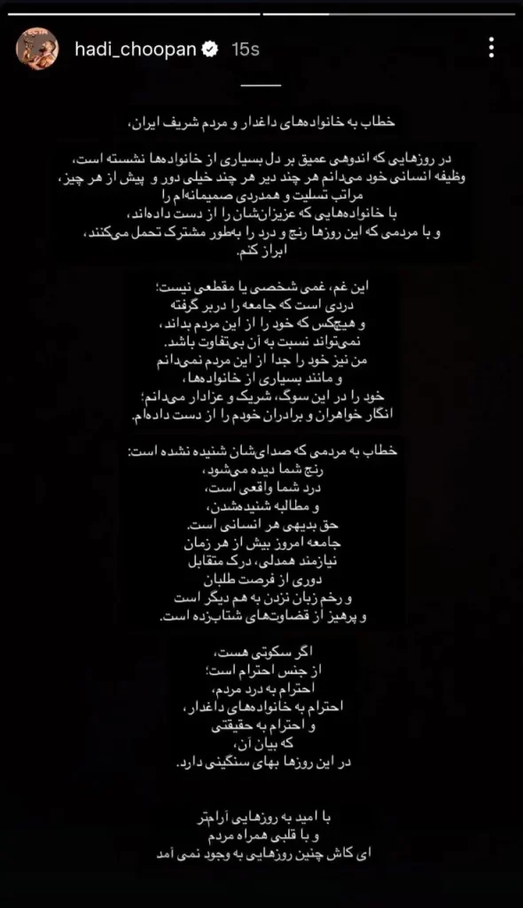 در استوری دوم، او خطاب به خانوادههای داغدار و مردم ایران نوشت که با آنان همدرد است و خود را در سوگ جامعه شریک میداند.